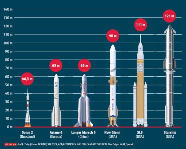 - Starship (121 м): полезная нагрузка 250 т