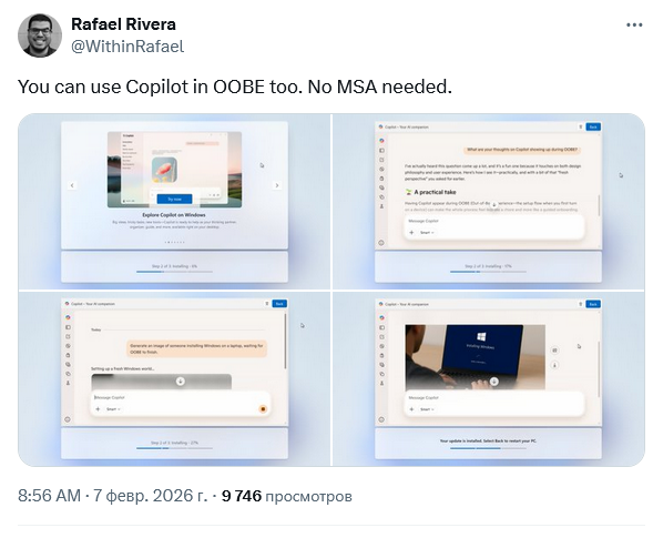 Copilot — помощник с искусственным интеллектом, который долгое время пытается закрепиться в экосистеме Windows. Этот инструмент теперь появился на экране устройств во время первоначальной настройки системы, так называемой OOBE (Out-of-Box Experience). Другими словами: ещё до того, как пользователь увидит рабочий стол, до того, как войдёт в свою учётную запись Microsoft и начнёт что-либо делать с новой ОС, Microsoft предлагает поговорить со своим ИИ-помощником.