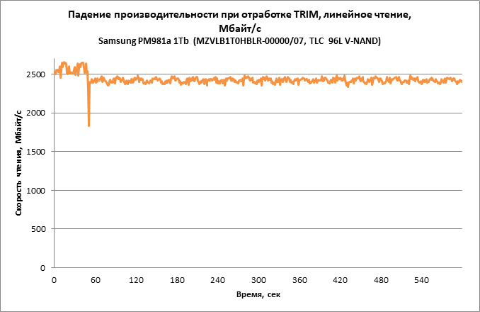 TBW не раскрывается, но если сопоставить с 970 EVO plus 1 Тб, основанной на аналогичной флеш памяти, то она должна равняться 600 Тб. Если параметры надежности PM981 и PM981a сопоставимы, в спецификациях на PM981 производитель указывает следующие определения: UBER (Uncorrectable Bit Error Rate) больше 10^15 чтения битов на 1 сектор и MTBF (Mean Time Between Failure) 1.5 миллионов часов и ни о каком TBW речи даже не идёт.
