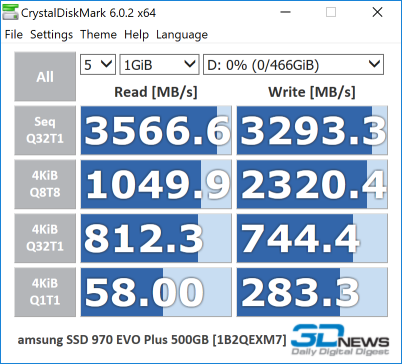 С помощью CrystalDiskMark (64bit) 6.0.1 в режиме случайных данных производился замер производительности, а полученные результаты сравнивались с данными 3Dnews для накопителей SAMSUNG: 970 EVO 512 Гб и 970 EVO Plus 512 Гб.