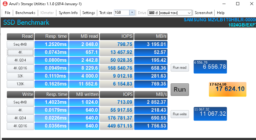 Среднее время доступа при операциях чтения и записи было получено в результате тестирования посредством AS SSD Benchmark версии 1.7.4739.38088.