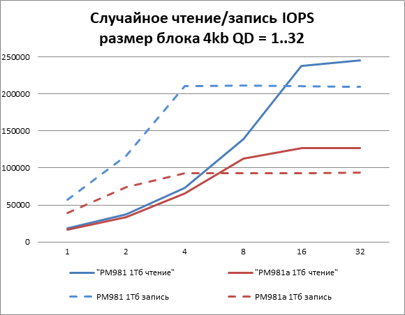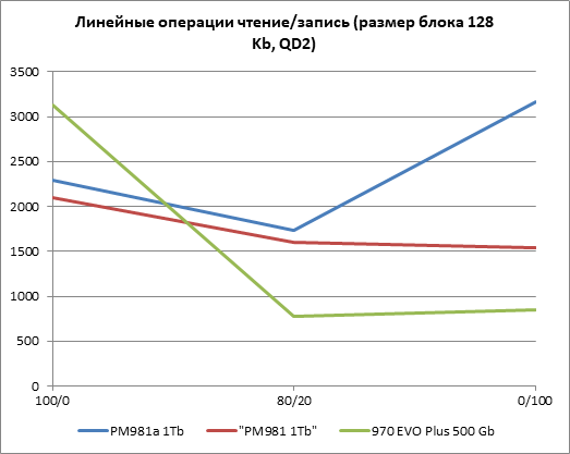 Видно, что параметры производительности PM981a 1Тб близки к таковым у Samsung 970 EVO Plus.