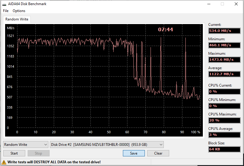 Интересно то, что заметно вырос объема SLC кэша, и ничем кроме как сменой драйвера я это не могу объяснить. При этом выросли рабочие температуры: на старте была 41, и за 23 минуты теста прогрелся до 70 градусов при температуре в комнате 20 градусов. В обоих случаях на x470 и x570 на последних 100 Гб пропускная способность накопителя растёт: до 1800 на x470 и до 2100 на x570. Рост пропускной способности примерно к середине объёма диска, на мой взгляд, связан с тем, либо иной алгоритм с уплотнением записи либо с тем, что на каждой микросхеме флеш массива памяти выделена область SLC кэша.