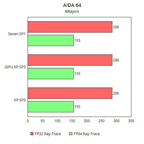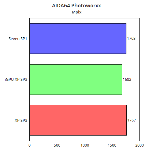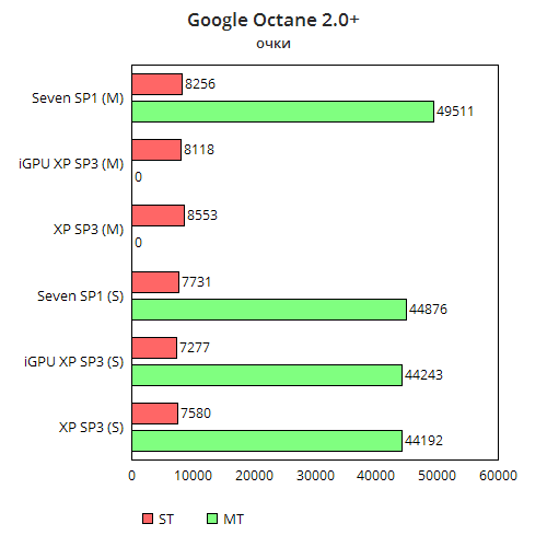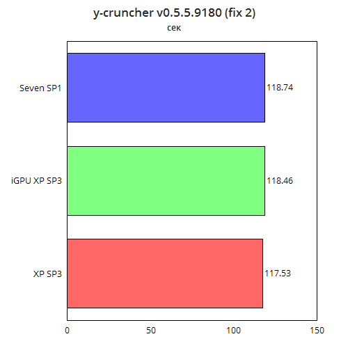 В данном тесте мы видим, что при участии интегрированной графики производительность ниже на 5%, что уже выше уровня погрешности. Разница между двумя операционными системами держится на уровне погрешности.