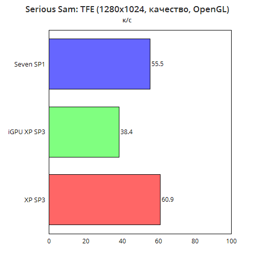 Игра Serious Sam показывает свой лучший результат в Windows XP на дискретной видеокарте. Intel GMA 950 медленнее ее на 59%. В среде Windows 7 игра работает медленнее на 10%.