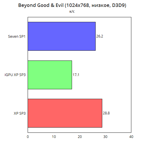 Игра Beyond Good & Evil показывает свой лучший результат в Windows XP на дискретной видеокарте. Intel GMA 950 медленнее ее на 68%. В среде Windows 7 игра работает медленнее на 10%. Здесь тенденция повторяется между двумя операционными системами.