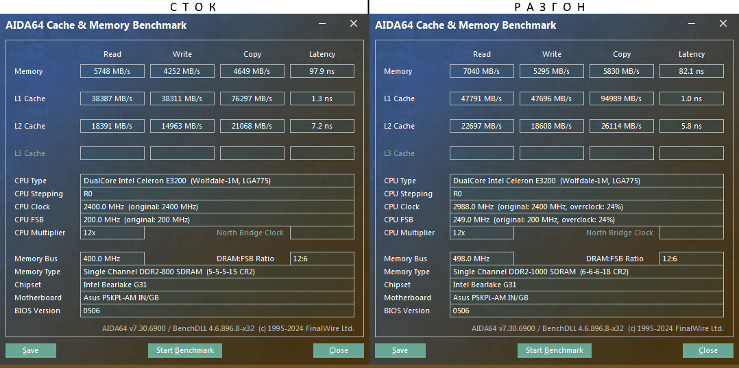 Так как материнская плата начального уровня имеет ряд ограничений, (напряжение можно только увеличивать, уменьшать нельзя + тайминги ОЗУ регулируются до предела 6-6-6-15) то при условии одноканальной оперативной памяти было принято решение ограничиться равномерным разгоном компонентов до среднестатических ~25% для компьютерного железа той поры. Напряжение питания были зафиксированы на стандартных значениях, тайминги выставлены в автоматический режим. При комплексном разгоне на 24% пропускная способность памяти увеличилась на 24%, задержки памяти снизились на 20%.