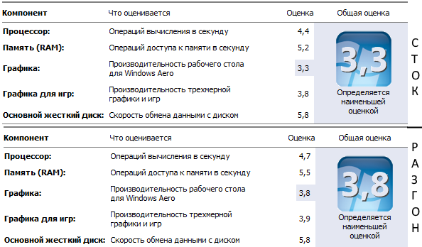 Встроенный комплексный бенчмарк Windows 7 так же отреагировал на разгон компонентов, в среднем прирост в нем составил всего 10%. Самой слабой частью системы по прежнему является видеокарта, исходя из результатов, ее разгон позволяет увеличить производительность в среднем на 10%.