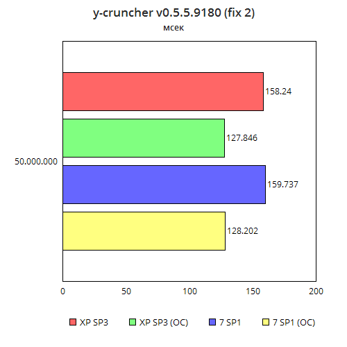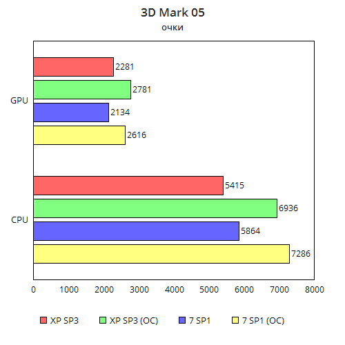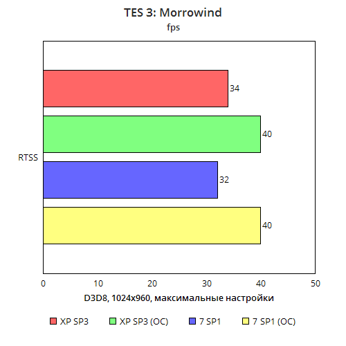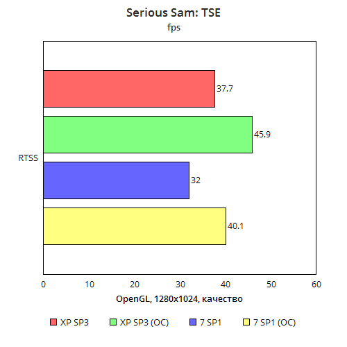 Для теста была выбрана стандартная записанная демка, в которой система выдавала меньшее количество кадров. При использовании разгона разница достигает в среднем 23,5%. Разница между операционными системами составляет 16,1% в пользу Windows XP.