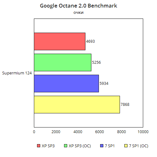 В тесте выполнения Java скриптов в веб-браузере сообщества Mozilla разница достигает в среднем 50%. Разница между операционными системами без разгона держится на уровне погрешности, при комплексном разгоне компонентов достигает 14,7% в пользу Windows 7.