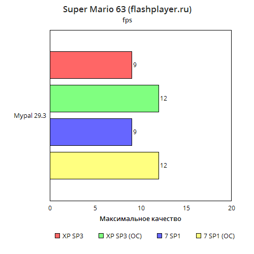 В тесте скорости отрисовки Adobe Flash Player на примере игры Super Mario 64, используя максимально возможные настройки качества в веб-браузере Mypal 29.3, ускорение за счет разгона достигает 33,3%. Разница между операционными системами полностью отсутствует.