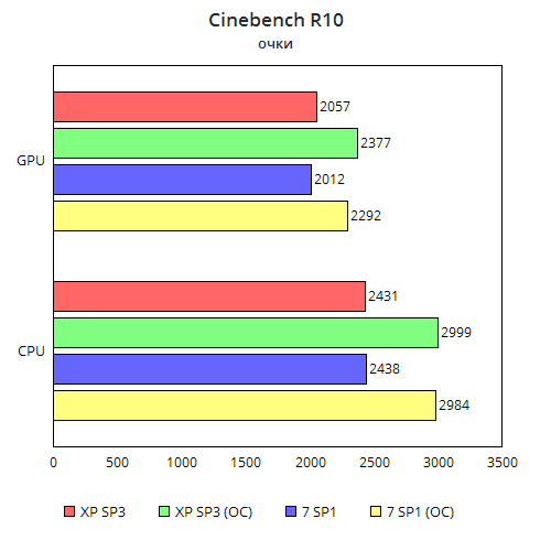 В тесте 3D рендеринга сцены разница в производительности в среднем составляет 22,9%. Разница между операционными системами составляет 4% в пользу Windows XP для графического теста, разница в процессорном тесте держится на уровне погрешности.