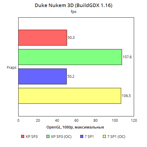 Замер частоты кадров в этой версии игры пришлось выполнять через Fraps, так как MSI Afterberner не перехватывал игру в среде Windows XP. Открывает серию игровых тестов любительский порт BuildGDX версии 1.16, написанный на языке JavaScript, на примере культовой игры Duke Nukem 3D. Сейчас уже доступна версия 1.17, которая из коробки способна выдавать производительность уровня разогнанного процессора и видеокарты, но она не работает в среде Windows XP из-за обновления версии JavaScript. Разгон компонентов позволяет достигнуть в этом примере внушительных 213%, что крайне немало. Разница между операционными системами держится на уровне погрешности.
