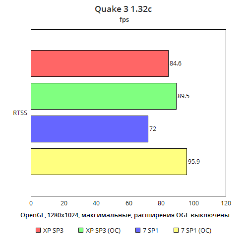 В динамической многопользовательской игре Quake 3 разница составляет 19,5% при разгоне. Разница между операционными системами без разгона на 17,5% больше в пользу Windows XP, при разгоне компонентов уже на 7,1% в пользу Windows 7.