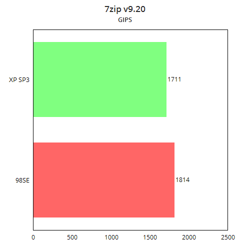 В бенчмарке 7Zip видим, что есть небольшое преимущество в скорости в среде Windows 98 SE, правда всего в 6%.