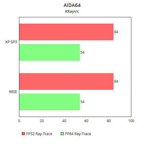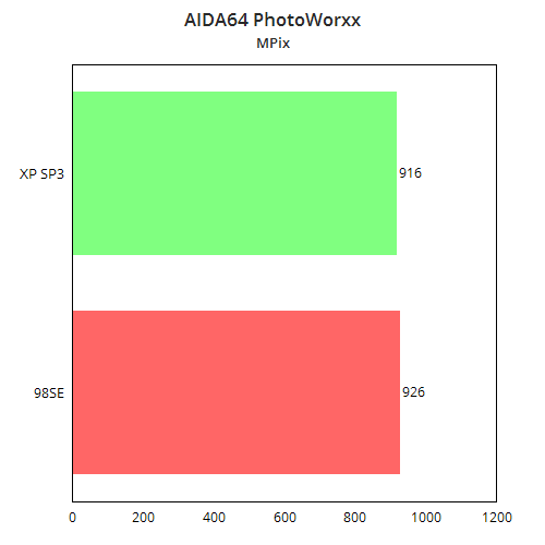 В тесте 2D графических преобразований от AIDA64 тенденция повторяется, но разница уже на уровне погрешности и составляет всего 1% в пользу Windows 98 SE.