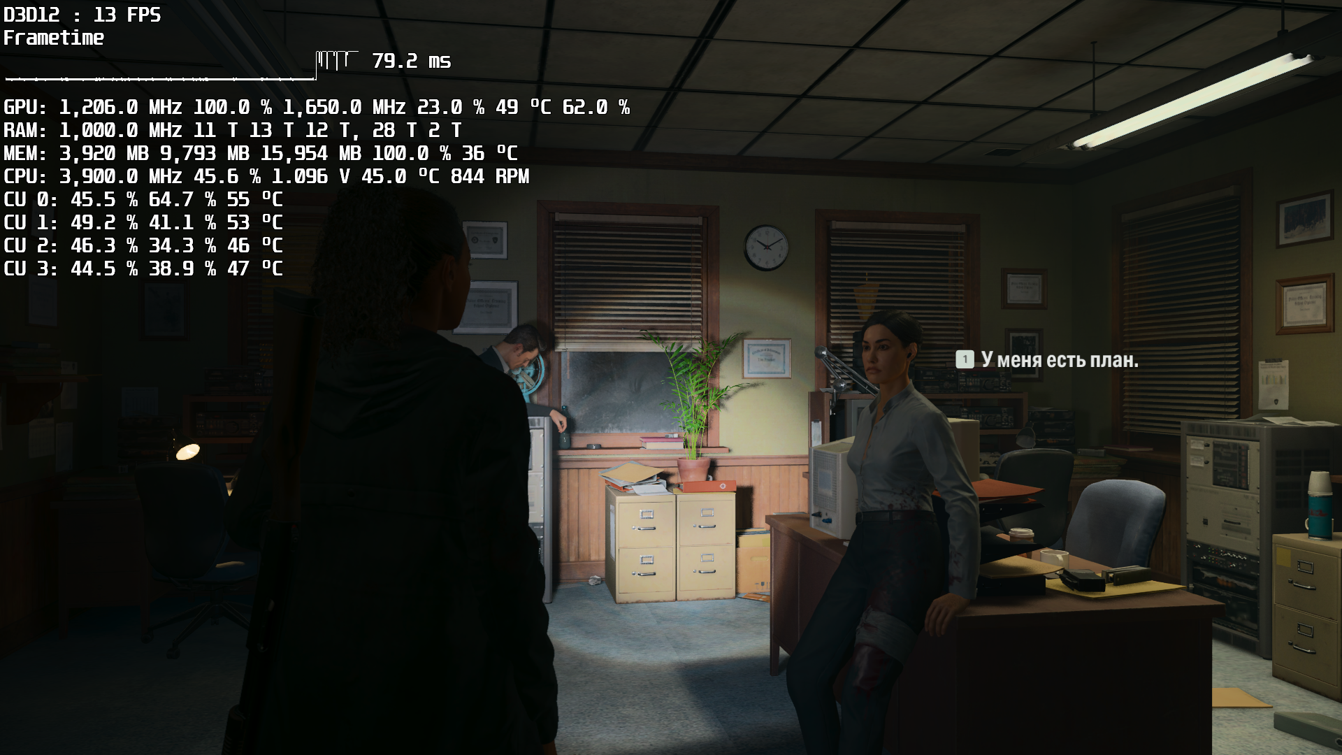 На скриншоте представлен уровень производительности в 13 кадров достигнутый при драйвере 25.8.1, разрешении 1920х1080 с включенным FSR в режим "качество" и выкрученными настройками в самый минимум. С такой частотой кадров проходить игру будет каторгой, плюс она стабильно вылетала, не продержавшись и минуты после загрузки уровня с ошибкой драйвера.