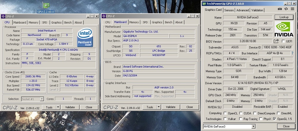 Pentium 4 в лице SL6PE имеет кодовое имя ядра Northwood и 512 Кб кеша второго уровня с тактовой частотой 2,66 ГГц и работающий на 533 МГц системной шине. Материнская плата Gigabyte GA-8SIMLH v3.2 имеет контроллер памяти DDR1 и поддерживает более быстрые процессоры, но в сегодняшних реалиях их всё сложнее и сложнее найти. Тем более, что топовый (для этой платы) Pentium 4 3,06 ГГц нередко ищется для редких материнских плат с памятью RIMM и наличием разъёма SBLINK, что добавляет к его редкости ещё и коллекционное значение. Поэтому приходится довольствоваться тем, что получилось раздобыть.