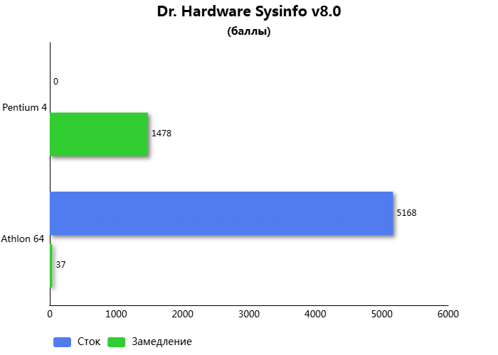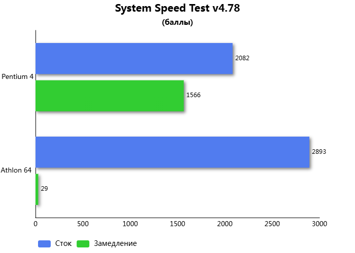 Резюмируя результаты тестов, получилось замедлить процессор на ~29%. Один из комплексных синтетических бенчмарков DOS позиционирует это "замедление" как близкое к уровню Athlon 1400. Если вспомнить предыдущий материал, то Athlon 64 удалось замедлить до уровня ~ Intel 386DX-40. Результат замедления архитектуры Netburst в данных условиях получился ужасным и недостаточным для корректной работы ранних DOS игр.