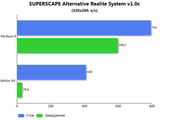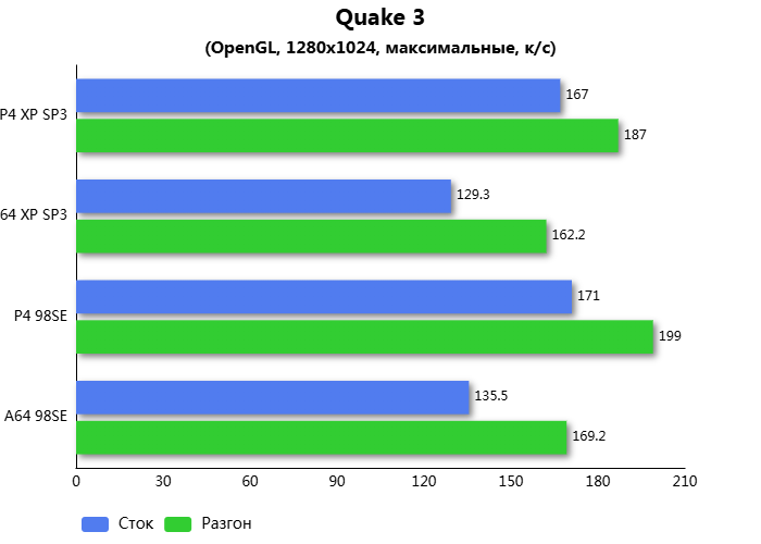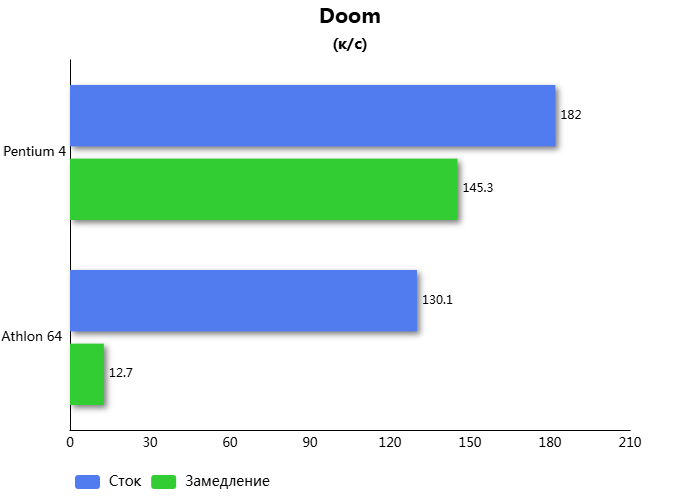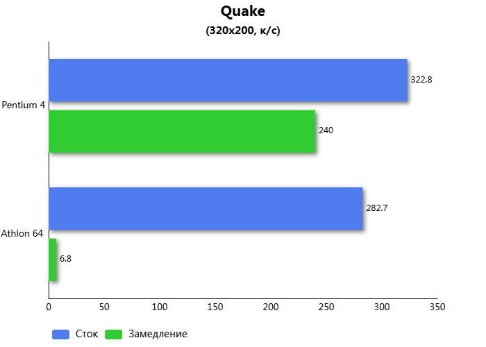 Во втором игровом тесте процессор удалось замедлить на 34,5%. При этом Athlon 64 на равных частотах с Pentium 4, быстрее на 17,7%. Quake - это игра знаменитая тем, что являлась полностью трёхмерной. И в ней Athlon 64 оказался быстрее при возросшей нагрузке на центральный процессор.