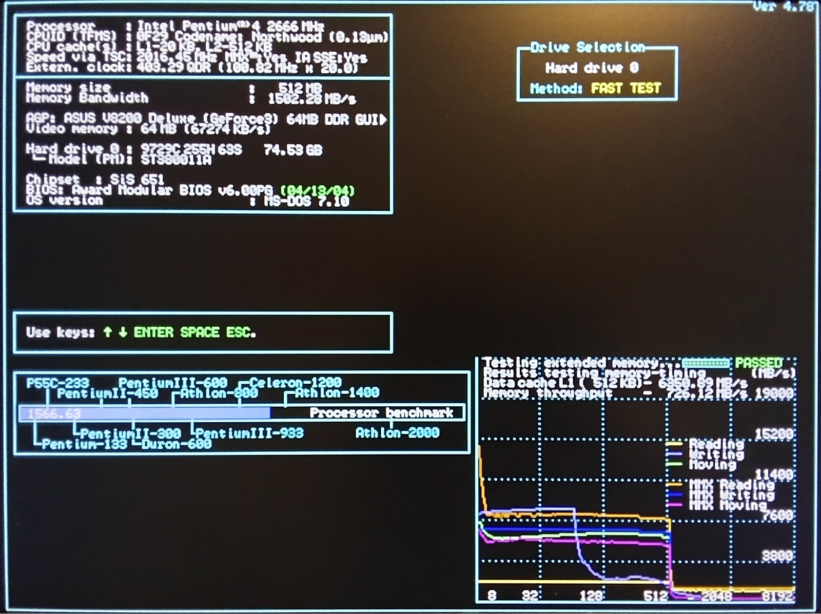 Ведущим фактором при тестировании в DOS является возможность замедления процессора любым из возможных способов (программным или аппаратным). На материнской плате под S-754 использовался комплексный метод с программно-аппаратным замедлением - со снижением множителя тактовой частоты до четырех и программным отключением кешей L1 и L2. В данном случае работает только аппаратный способ и удалось понизить частоту шины с 133 до 100 МГц, что позволило снизить тактовую частоту всего на 600 МГц. Отключение кешей L1 и L2 у архитектуры Netburst не работает корректно, ввиду особенностей архитектуры.