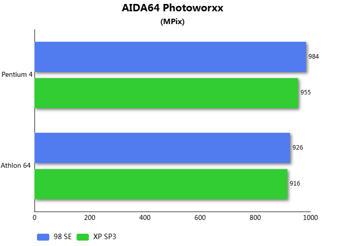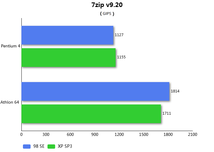 В синтетическом тесте архивации между операционными системами разница производительности держится на уровне погрешности. При этом Pentium 4 чуть быстрее в среде Windows XP, а Athlon 64 в Windows 98SE. В этом тесте на стоковых тактовых частотах Athlon 64 быстрее Pentium 4 на ~57%.