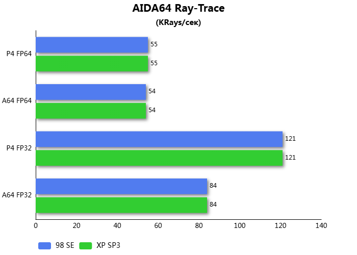 В синтетическом тесте расчета трассировки лучей, между двумя операционными системами нет разницы производительности. В этом тесте, на стоковых тактовых частотах Pentium 4 быстрее Athlon 64 на ~44%, вероятно, из-за более высоких тактовых частот.