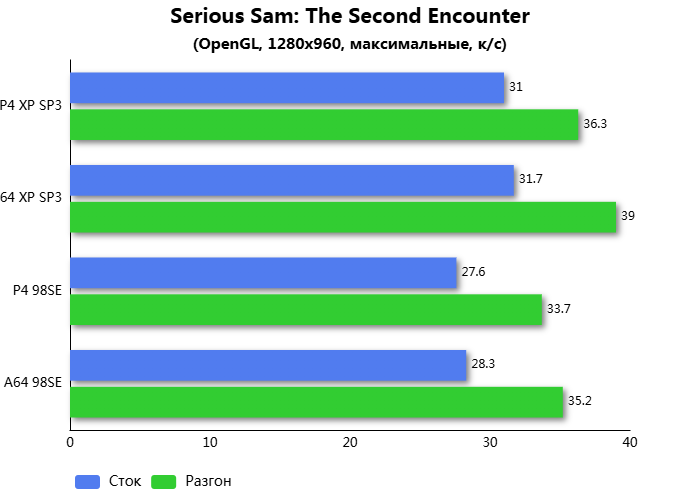 Serious Sam закономерно, как и в предыдущем материале, быстрее уничтожает полчища монстров в среде Windows XP. Athlon 64 быстрее Pentium 4 на ~ 7,4%.