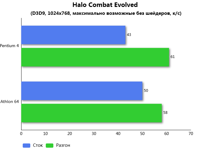 В игре Halo внезапно обнаружился нестабильный результат. Вариант без разгона отработал на ~16% быстрее на Athlon 64. Тогда как разогнанный вариант отработал на ~5% быстрее на Pentium 4.
