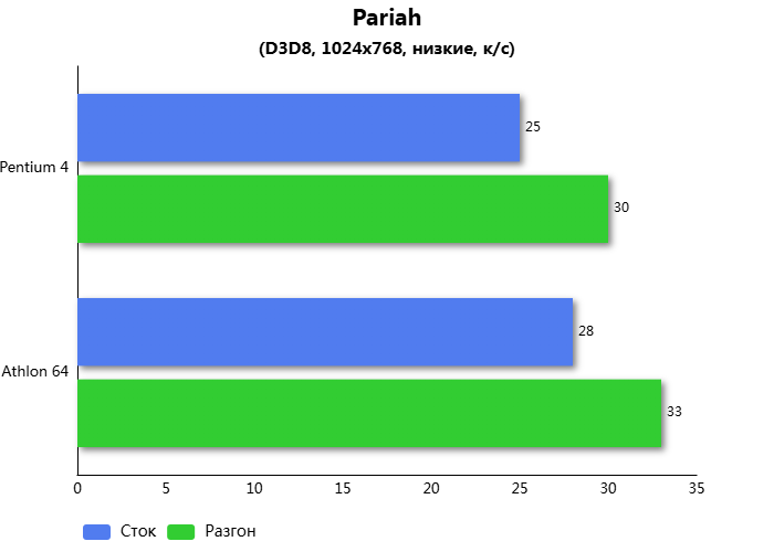 В Pariah разница производительности составляет 12% в пользу Athlon 64. Отчасти, данную разницу производительности не ожидаешь от игры использующей предыдущую версию DirectX, однако игровое приложение отдало предпочтение Athlon 64 как в стоковом варианте, так и в разогнанном.