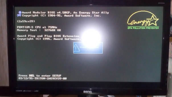 Фото с монитора после инициализации биос с замедленным процессором до 75 МГц джамперами и установленными 32 Мб EDO памяти.