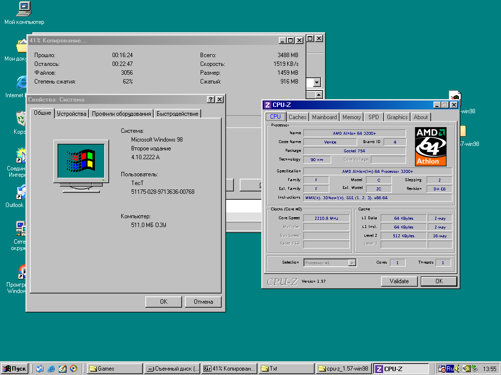 Скриншот CPU-Z процессора Athlon 64 3200+ снятый в среде Windows 98 SE