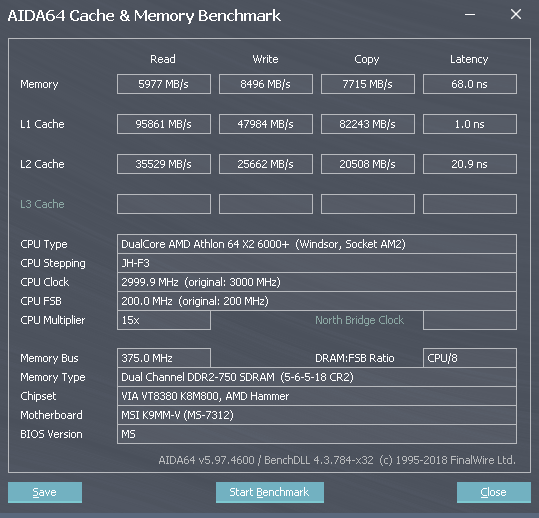 Скриншот теста кешей и памяти AIDA64 снятый при использовании MSI K9MM-V