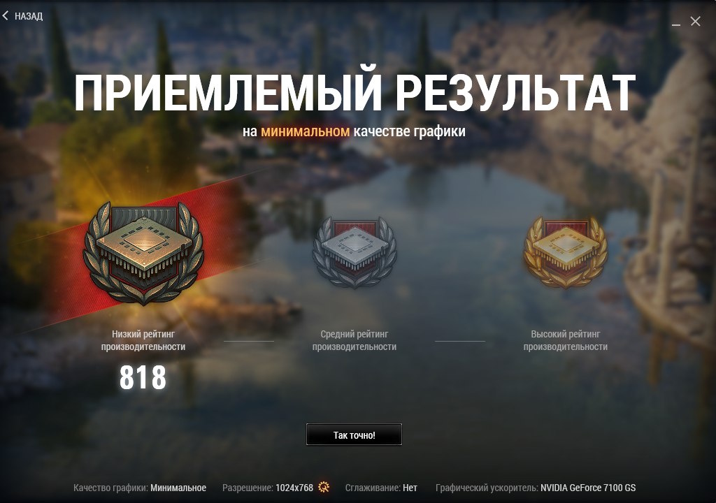 Скриншот результата тестов бенчмарка WoT Encore на GeForce 7100 GS