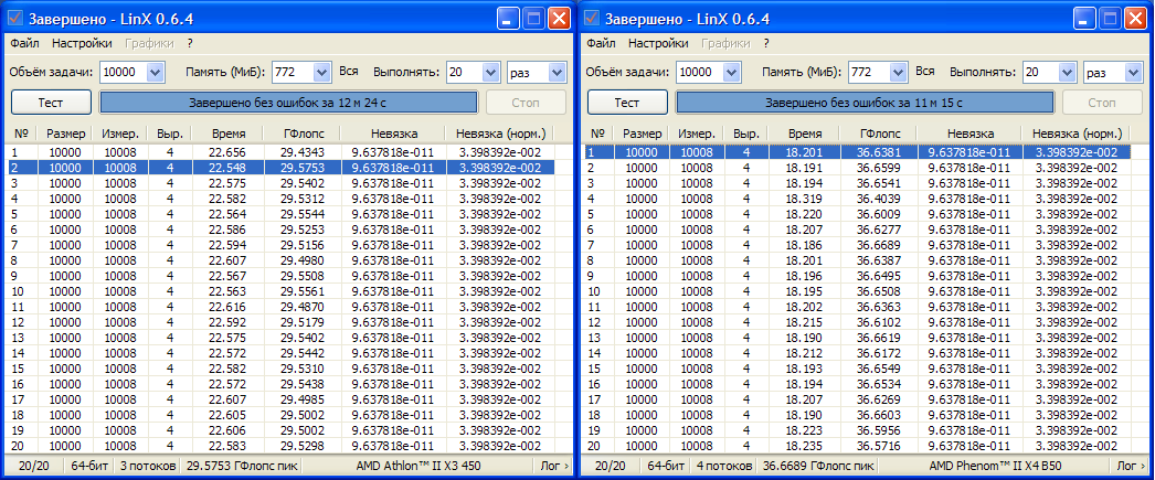 Сравнительные скриншоты до и после разблокировки 4 ядра и замер производительности в Linx