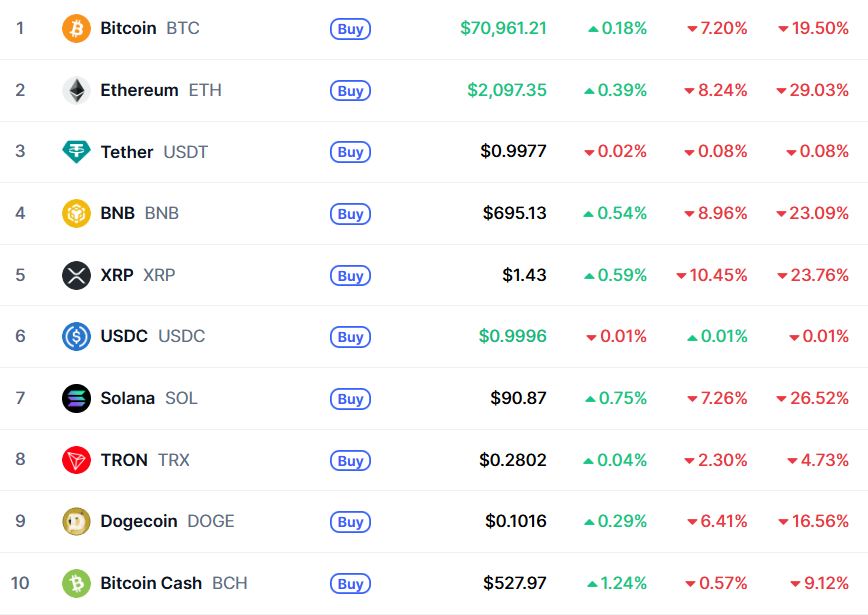 Ethereum (ETH), вторая по рыночной капитализации криптовалюта, также демонстрирует значительное снижение цен. За последние семь дней её рыночная цена упала примерно на 30%, достигнув отметки в 2 099 долларов.