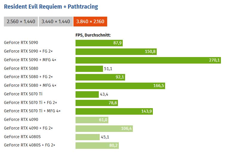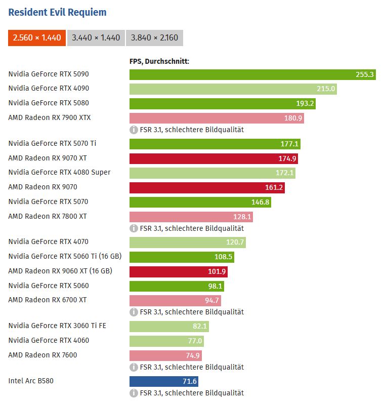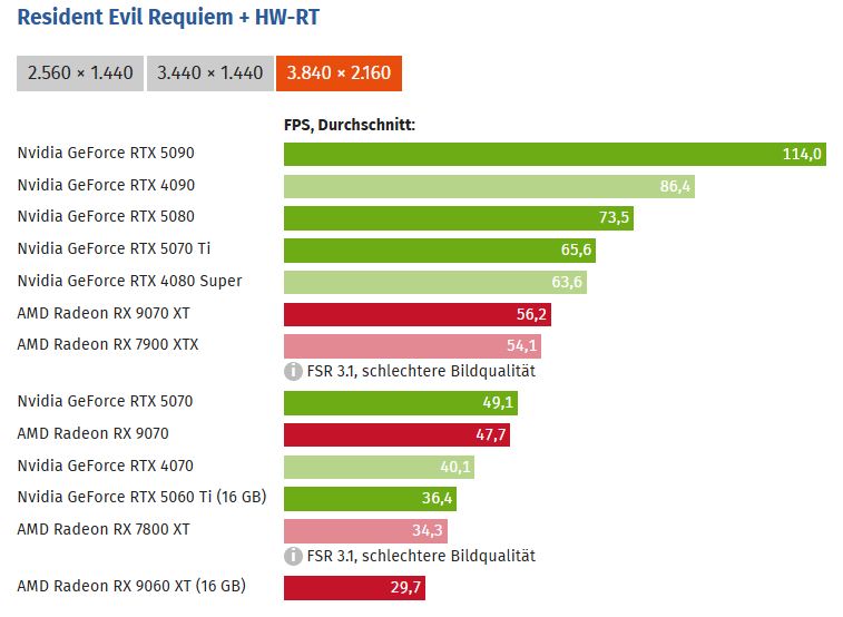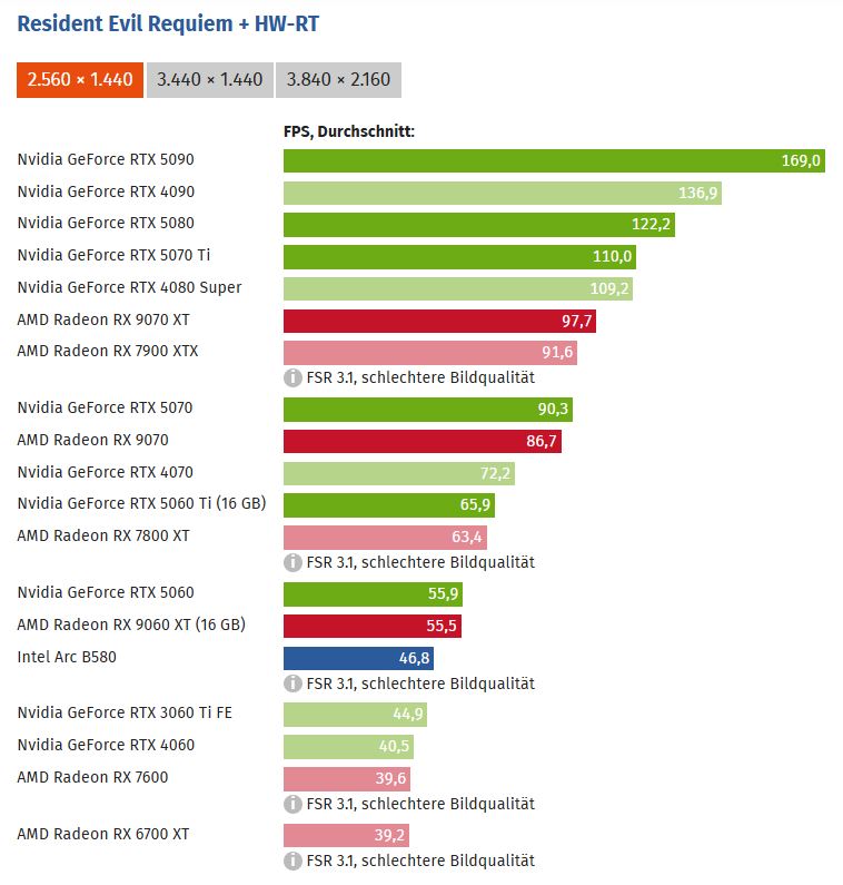Специалисты портала ComputerBase протестировали свежий хоррор Resident Evil Requiem на 19 современных видеокартах различных производителей — NVIDIA, AMD и Intel. Все устройства были протестированы совместно с мощным процессором Ryzen 9800X3D, оснащенным 48 ГБ высокоскоростной оперативной памяти формата DDR5-6000 CL30 и материнской платой MSI MPG X870E Carbon WIFI.