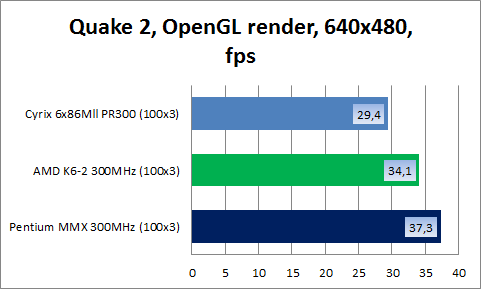 Quake 2 3.20, тестировался в режимах: Software Render 320x240 и OpenGL Render, 640х480, 16bit.
