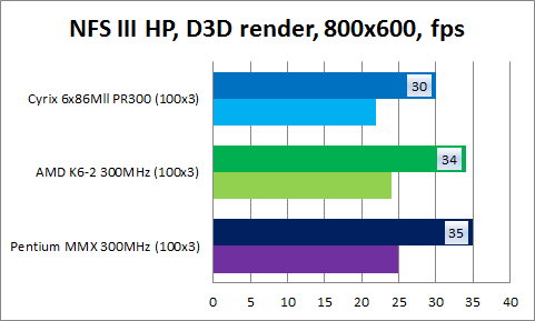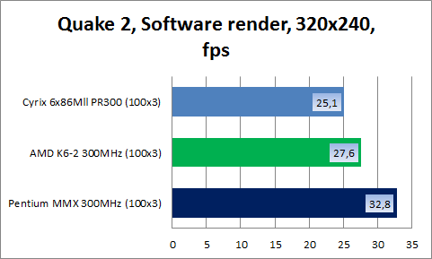 Не так уж и плохо. Пентиум благодаря известной заточке под его микроархитектуру тут лидер, но К6-2 отстает всего на 10%. И даже Cyrix смотрится не так уж убого, отставая еще на 15% и почти дотянувшись до заветных 30 фпс.
