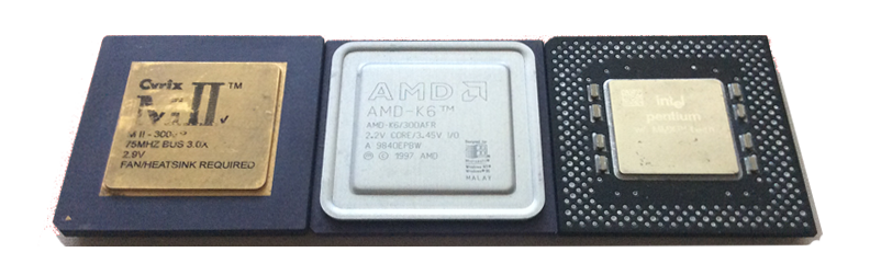 CPU: Cyrix 6x86 MIIv PR300, AMD K6-2 350, Intel Pentium MMX 233MHz (socket 7).