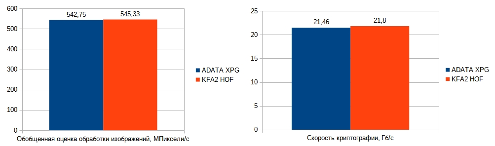 В Sisoftware Sandra в тестах памяти комплект на чипах Samsung B-die лучше на 4,3% и 3% в пропускной способности памяти и латентности соответственно. В криптографии и обработке изображений комплект ADATA XPG Spectrix D50 медленнее на 1,56% и 0,47% соответственно.