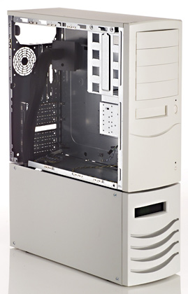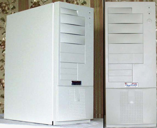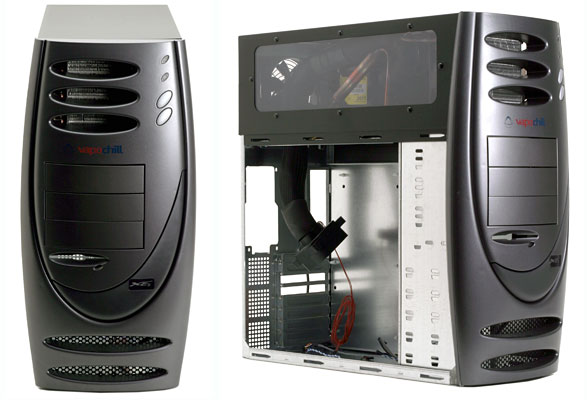 Если посмотреть на изображения VapoChill то мы увидим корпус формата Tower. Корпус имеет серый, стандартный для офисных корпусов тех лет цвет. В корпус возможна установка Extended ATX материнских плат, с возможностью установки до 7-ми плат расширения. Пользователю доступно два 5.25" отсека и три 3.5" отсека. Крышка корпуса выполнена из единого листа железа в виде буквы "П", сейчас корпуса с такой системой крепления боковых панелей не производятся.
