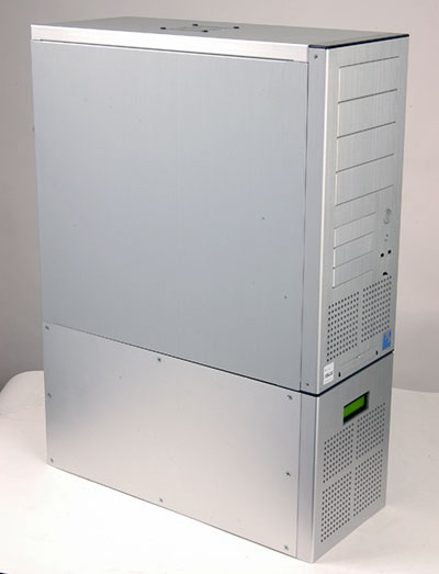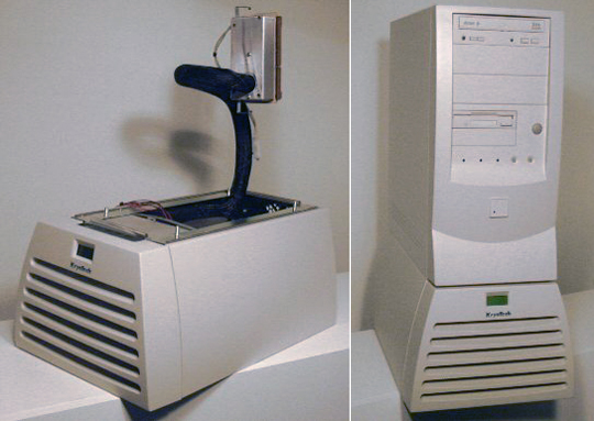 Внизу установки - компрессорный отсек, где располагаются компрессор, радиатор, конденсер и тихоходный вентилятор увеличенного диаметра. На передней панель, стоит жидкокристаллический индикатор системы встроенного температурного контроля, вверху - пространство стандартного АТХ корпуса.
