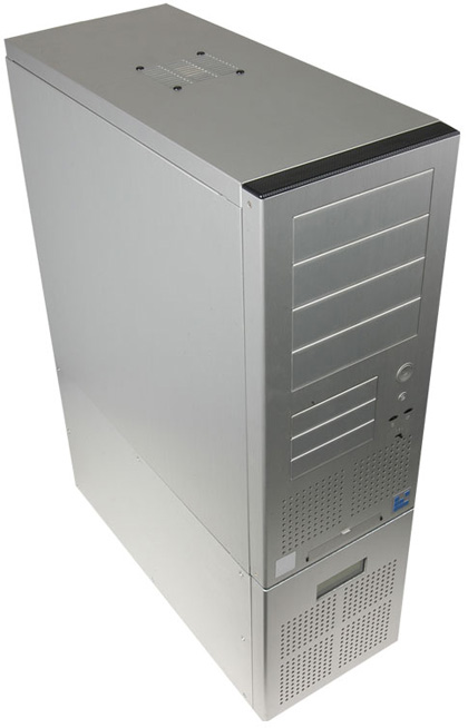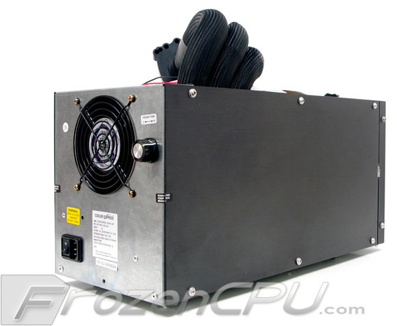 Корпус оснащен четырьмя 5,25' внешними отсеками, двумя наружными отсеками 3,5' , блоком питания на 350W. Компрессор питается от БП, такая схема питания характерна для первых (phase-change) систем, современные криосистемы питаются напрямую от сети 220V, т.к энергопотребление других компонентов ПК резко возросло и мощности БП попросту не хватает. В корпусе также присутствуют несколько посадочных мест для дополнительных вентиляторов.