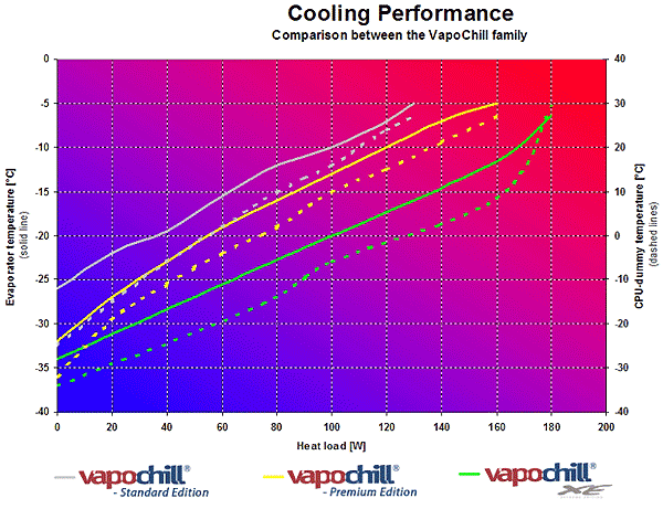 Xtreme Edition (XE) позволяет рассеивать 180Вт тепла при температуре процессора -5 градусов. В простое температура достигает -35'С. В отличие от других систем серии VapoChill, Xtreme Edition использует другой теплоноситель фреон (R404a), с более низкой температурой кипения (-46.4С при атмосферном давлении), модель компрессора такая же, как у SE - Danfoss BD35F.