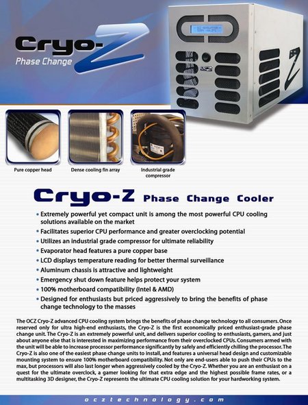 OCZ Technology Group американская компания известна прежде всего как производитель высокоскоростной оверклокерской памяти, блоков питания и прочих аксессуаров для разгона. На рынке памяти компания впервые появилась в 2000-м году (европейское представительство открыто в конце 2005 года), однако и по сей день продолжает активно развивать это направление своего бизнеса. Как пишет сама про себя OCZ Technology, она была создана энтузиастами для энтузиастов и является инноватором во многих сферах. Очередной этап инноваций у OCZ наступил 5 января 2006 года, когда официально открыла двери для посетителей уже традиционная индустриальная выставка International CES 2006, проходящая ежегодно в первых числах января в США в городе развлечений - Лас-Вегасе, штат Невада. На CES 2006 OCZ представила предсерийный образец своей phase-change системы охлаждения. Новинка получила имя "Cryo-Z". Ниже приведены фотографии Cryo-Z с CES 2006.