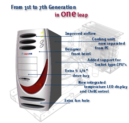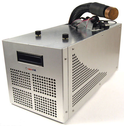 Сама система выполнена в виде отдельного блока в алюминиевом корпусе от Lian-Li, доступны разные цветовые гаммы, и предполагает установку на себя сверху компьютерного корпуса, что позволяет пользователю подобрать более удобный для себя case. К слову о корпусах, теперь пользователь может выбрать понравившийся ему case из модельно ряда Lian-Li (PC-60, PC-61, PC-65, PC-7, PC-12, PC-37, PC-82, PC-601, PC-0700,PC-0716a, PC-0716s, PC-6077, PC-6085A.) Компрессор питается от сети 220В. Система позволяет рассеивать 240Вт тепла при температуре процессора -25С (выдающейся показатель!), 200 Вт при температуре процессора -33С В простое температура достигает -48'С. Такие показатели стали возможны благодаря используемому фреону R507 вместо стандартного R404A. Система отличается от остальных VapoChill как возросшей производительностью, так и возросшим уровнем шума и нагрева компрессора, чем объясняется наличие большого количества вентиляционных отверстий в корпусе.