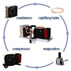Как и в холодильнике используется хладагент (фреон), проходящий через ступень испарения (превращения жидкости в газ), а затем конденсации, из газа в жидкость. Ниже приведена схема этого процесса.