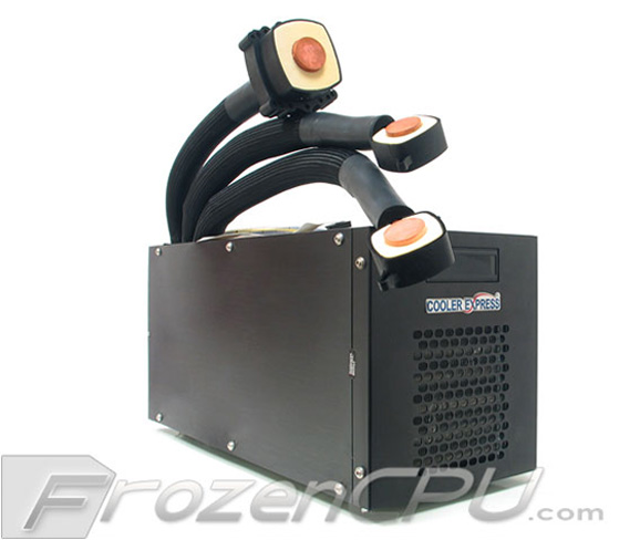 Очень интересная фреонка была замечена (середина 2006 года) в американском интернет-магазине www.frozencpu.com Интересна она тем, что имеет целых три! испарителя, такой конфигурации пока не предлагает ни одна кампания, серийно производящая криосистемы охлаждения. Однако малоизвестная компания из Тайваня - Cooler Express занимается производством таких фреонок. Модель называется Cooler Express “Hydra” SLI. Как видно из названия, такая гидра способна охладить высокопроизводительную систему с двумя видеокартами, будь-то NVIDIA SLI или ATI CrossFire плюс центральный процессор.