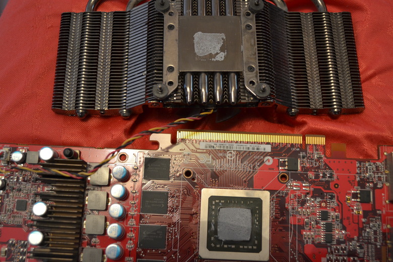 Решил разобрать.Как сказал продавец,карту он не разбирал,значит и паста там возможно высохла. Чтож, разборка заключалась в откручивании 4 болтов. заводской термопасты я не обнаружил,лишь вокруг чипа были ее мелкие остатки. на чипе паста была в "рабочем" состоянии. Всё равно заменил на МХ-4. Нанес немного пасты (хотя я на процессор столько же наношу,если не меньше), проверил отпечаток